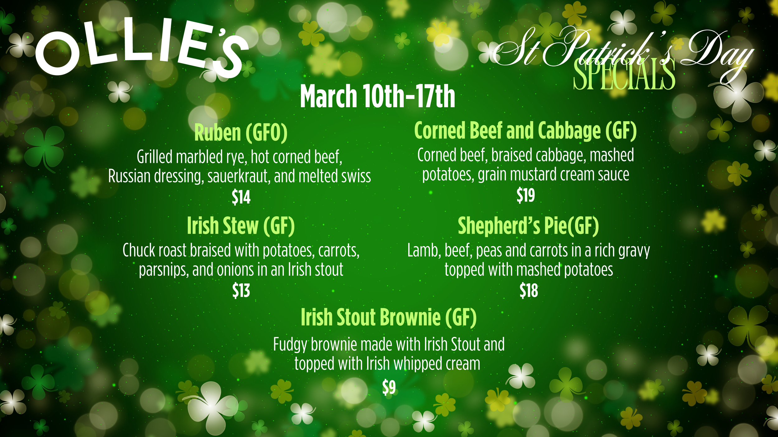 We offer culinary accommodations like gluten-free, vegetarian, vegan, and take notifications of allergens seriously. Ollie’s is proud to offer extensive gluten-free and celiac-friendly options. We use a dedicated gluten-free fryer and clearly mark items that are gluten-free or can be prepared gluten-free upon request.